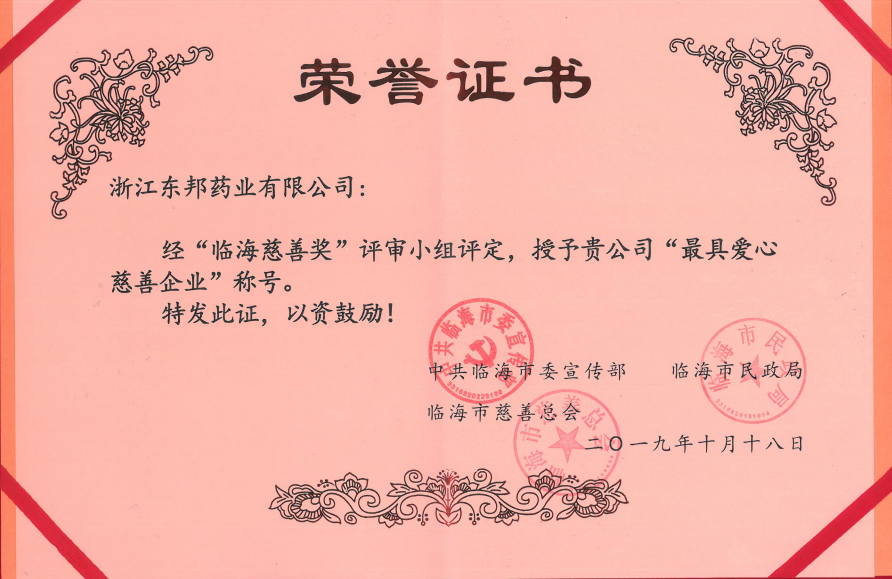 会议宣读了“临海慈善奖”有关表彰文件,对五年来在慈善公益领域作出突出贡献的单位和个人进行表彰。表彰了 “最具爱心捐赠楷模” 单位4家、“最具爱心慈善企业”11家单位。其中,东邦药业获颁“最具爱心慈善企业”奖。